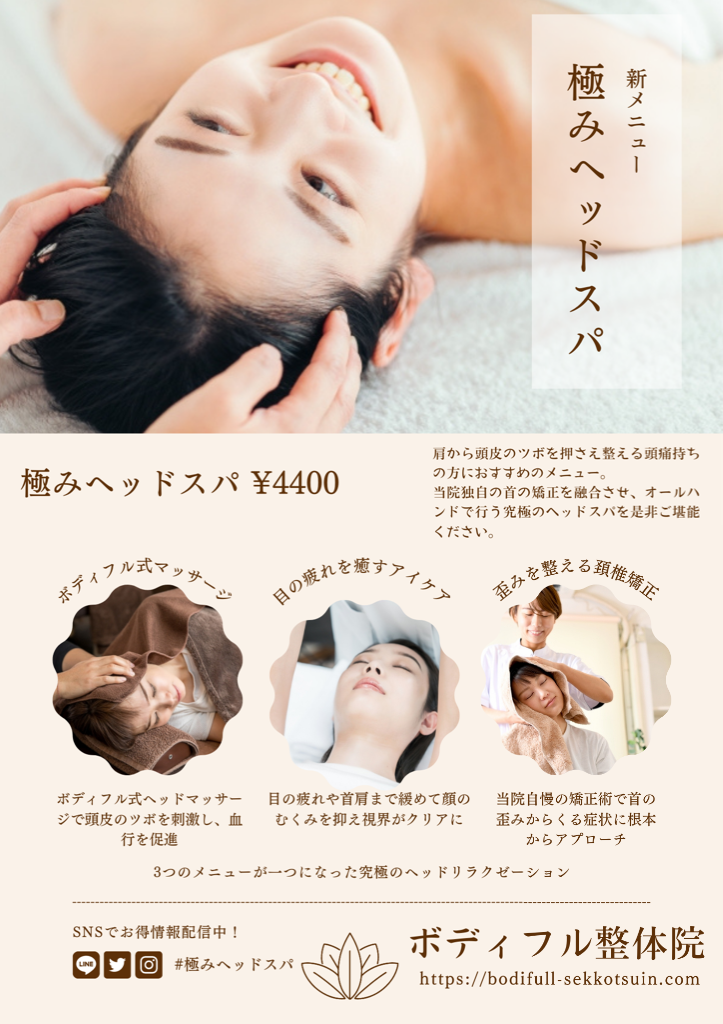 通常のヘッドスパとは違い、ボディ接骨院では首の矯正もできるから歪み整えてることができます。